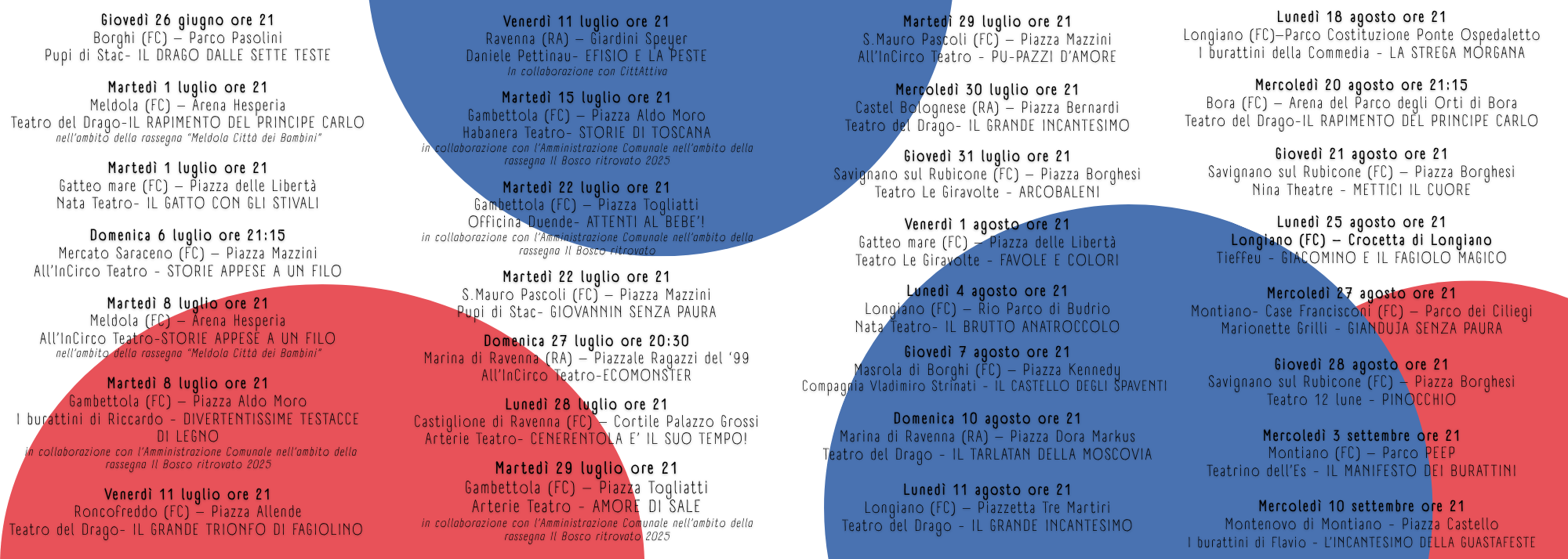 La rassegna è a cura di Teatro del Drago/Famiglia d’Arte Monticelli e si svolge con il sostegno della Regione Emilia-Romagna, del MiC Ministero della Cultura e dei Comuni aderenti.